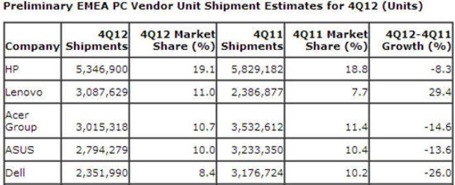 HP er tilbake på toppen av listen, etter at Lenovo lånte førsteplassen i tredje kvartal. Men i motsetning til HP, har Lenovo økt pc-salget når man sammenligner med fjerde kvartal i 2011.
