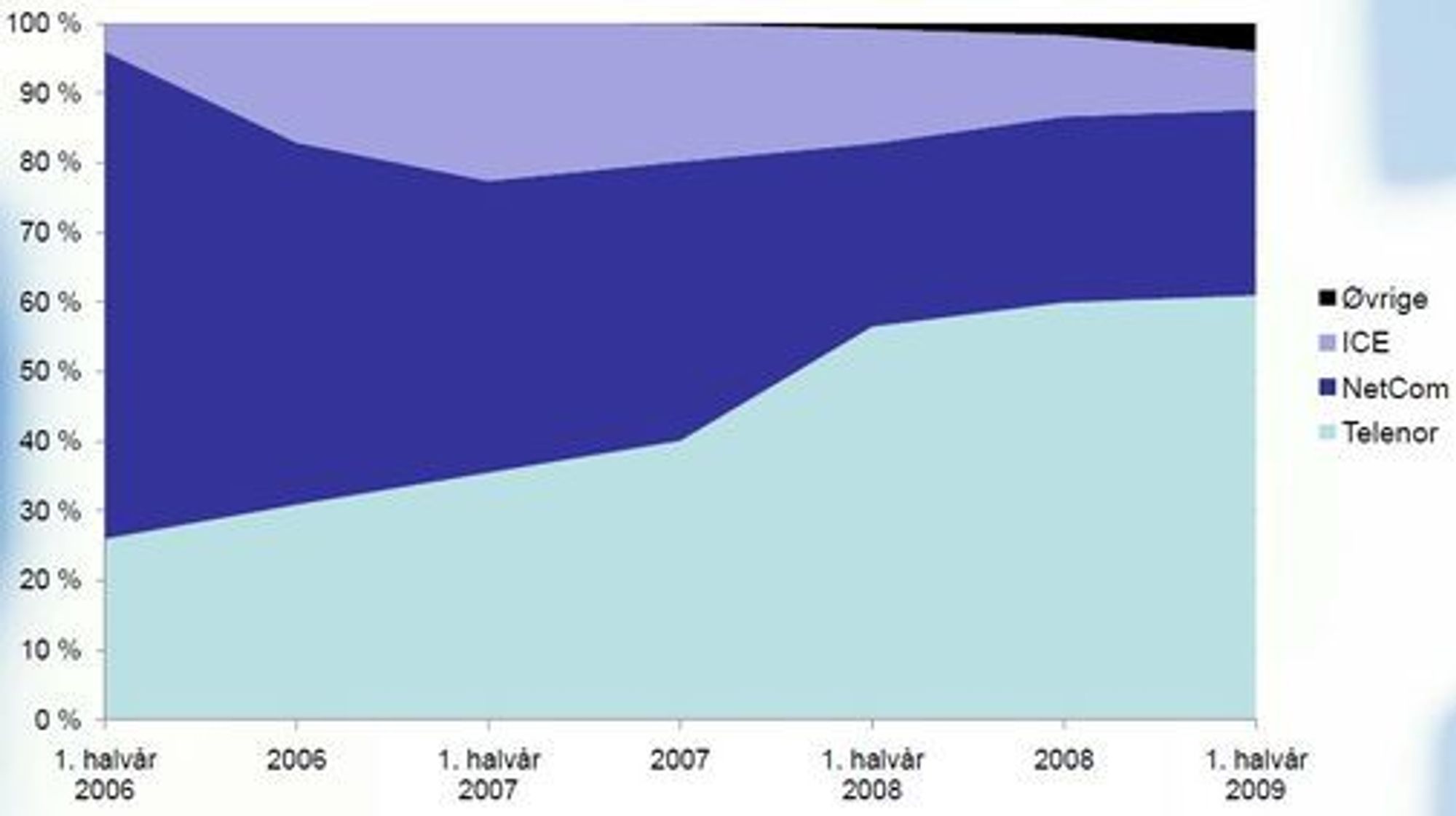 Ice.net, som er den tredje største leverandøren av mobilt bredbånd i Norge, hadde ved utgangen av første halvår 8,4 prosent av kundene. Men disse kundene stod til sammen for 13,3 prosent av datatrafikken.