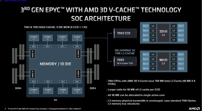 Milan-X-prosessorene, også kalt for 7003 High Cache Series, består egentlig av ni separate brikker. Den ene av disse tar seg av I/O. De åtte andre er CCD-er (Core Complex Dies) som hver inneholder mellom to og åtte Zen 3-kjerner og 96 megabyte med L3 cacheminne som kan deles fritt mellom kjernene i den samme CCD-en. Totalt har de nye prosessorene 768 megabyte med L3 cacheminne.